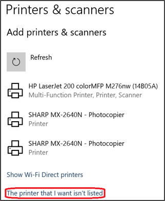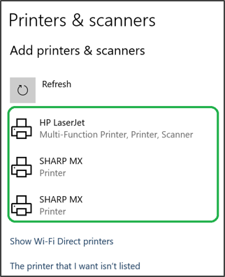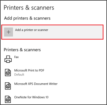 1) From the Start Bar, go to the 'Printers & Scanners' Settings. Select 'Add a Printer or Scanner', and let the automated search run. Any devices found during this process will be displayed below.