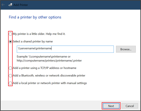 4) Select the appropriate check-box to fill ('Select a shared printer by name' to add a network printer, etc). Then, type the full & precise name of the printer into the text field below and select 'Next'. To find the exact printer name, try to find a peer with a connection to the printer, and copy down the name it displays in their Printers & Scanners Settings menu.