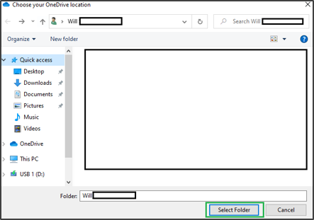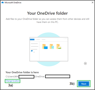 3) The next window will prompt you to select your OneDrive folder. If you have already selected a OneDrive folder on this device previously, navigate to that folder and select 'Use this folder'. If you haven't previously set a OneDrive folder, select a location, and continue with the on-screen instructions and advance to Step 3a). If you are happy with the default OneDrive folder displayed under the 'Your OneDrive folder is here' subheading, then you can continue without changing the location from Step 3b).