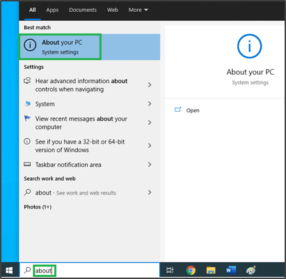 2) In the Start Bar, type 'About', then select the 'About this PC' settings window.
