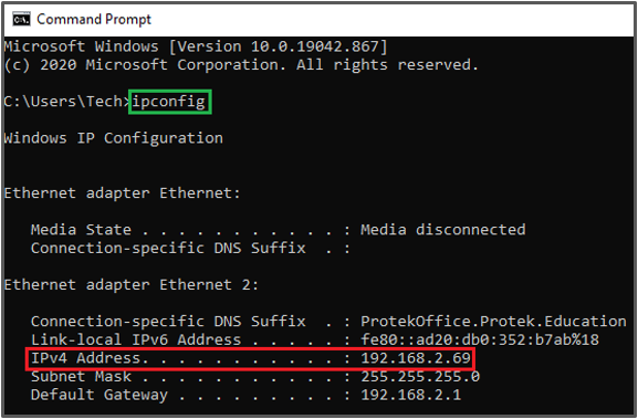 3) In the Command Prompt interface, type ' ipconfig ' (without the ' ' ) and press Enter. Your current IPv4 address will be displayed on the 'IPv4 Address' row.