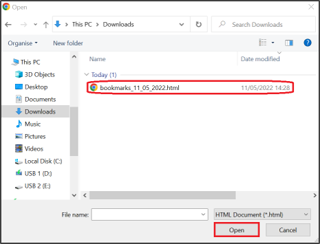 4) Select the Chrome bookmarks html file you want to import, then click Open.
