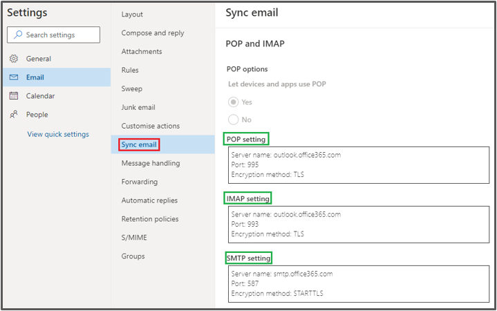 3) Select the 'Sync email' tab from the menu on the left of the Settings window. The information you require will be in the three 'Setting' boxes to the right; which box you use depends on the protocol(s) you intend to use.