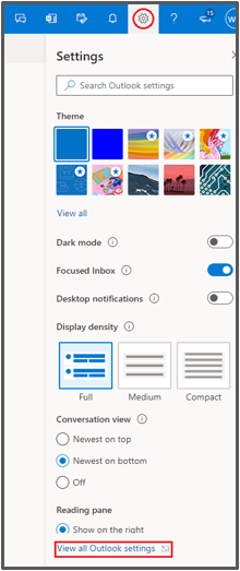 2) In Outlook Web, select the 'Settings' dropdown, then click the 'View all Outlook setting' link.
