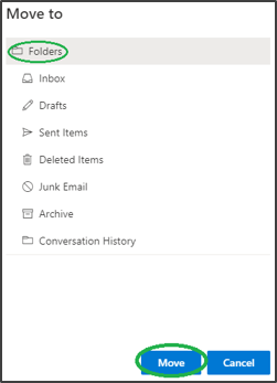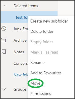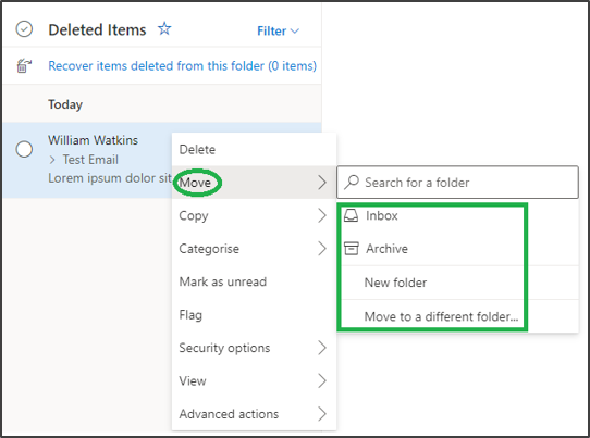 2) Right-click the email you'd like to restore, then select 'Move' in the dropdown menu. Select the location you would like to relocate the email to.