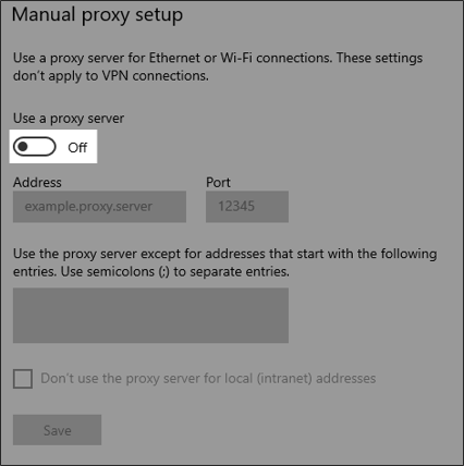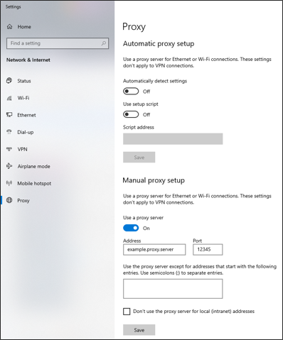 1. Open Windows Settings, and navigate to Network & Internet > Proxy Settings. Your settings may be configured differently to below.