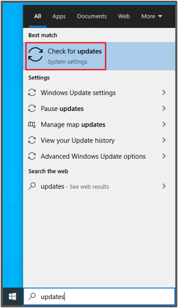 1) From the Start Bar, type 'Updates', and select the 'Check for updates - System settings' option.