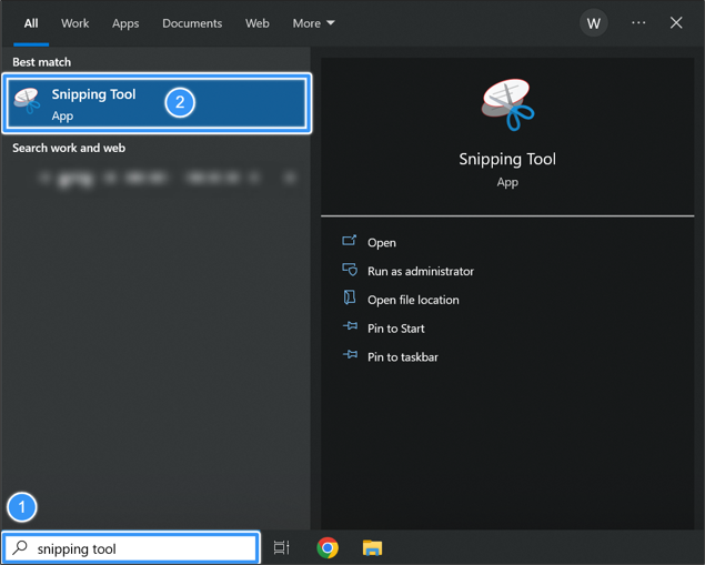 2. Type 'Snipping Tool' into the search box and select the Snipping Tool application.